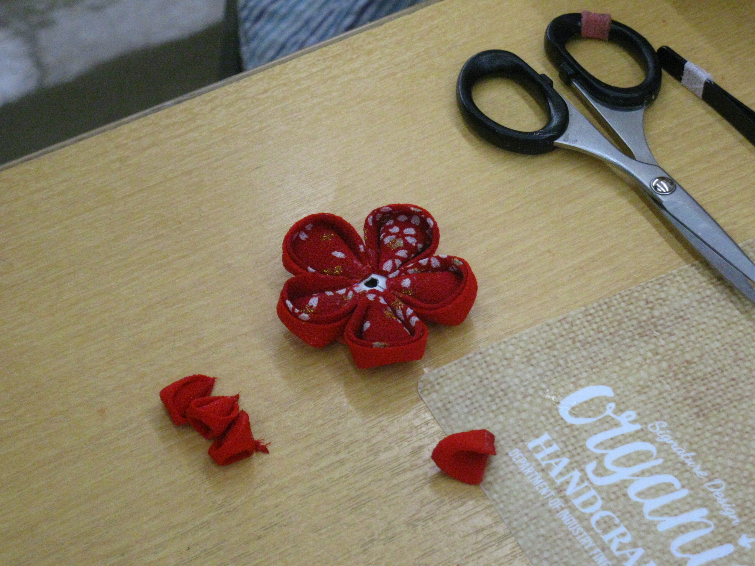 江戸時代から伝わる伝統工芸のつまみ細工の講座を実施しました。今回は三歳の七五三用の髪飾りを作ります。