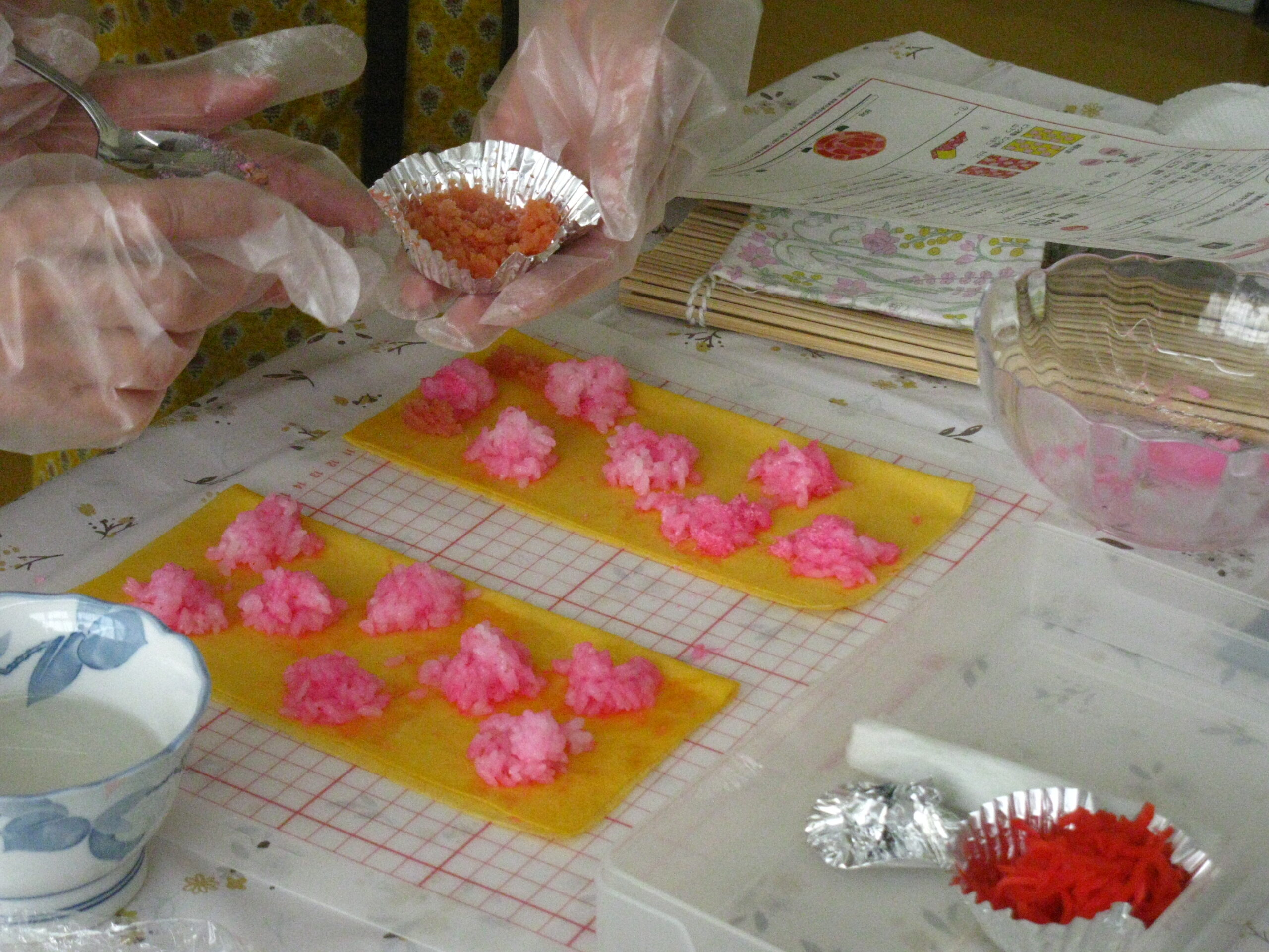 食材は”花びら”に、桜でんぶ、たらこ、紅ショウガ、薄焼き卵、”葉”に野沢菜、そして白酢飯と白ごま、海苔です。