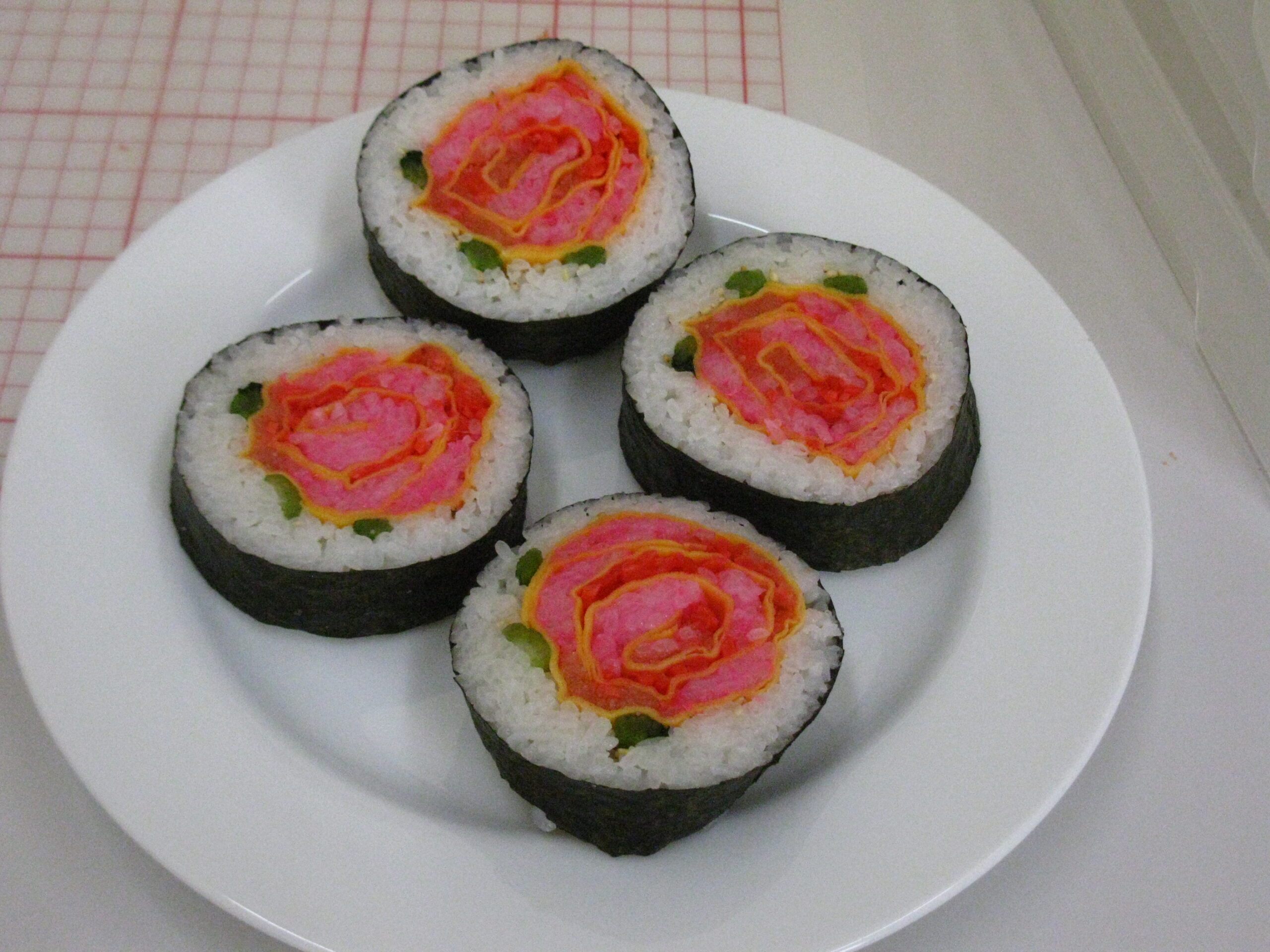 見てもおいしい、食べても美味しいバラの絵巻き寿司の完成です!