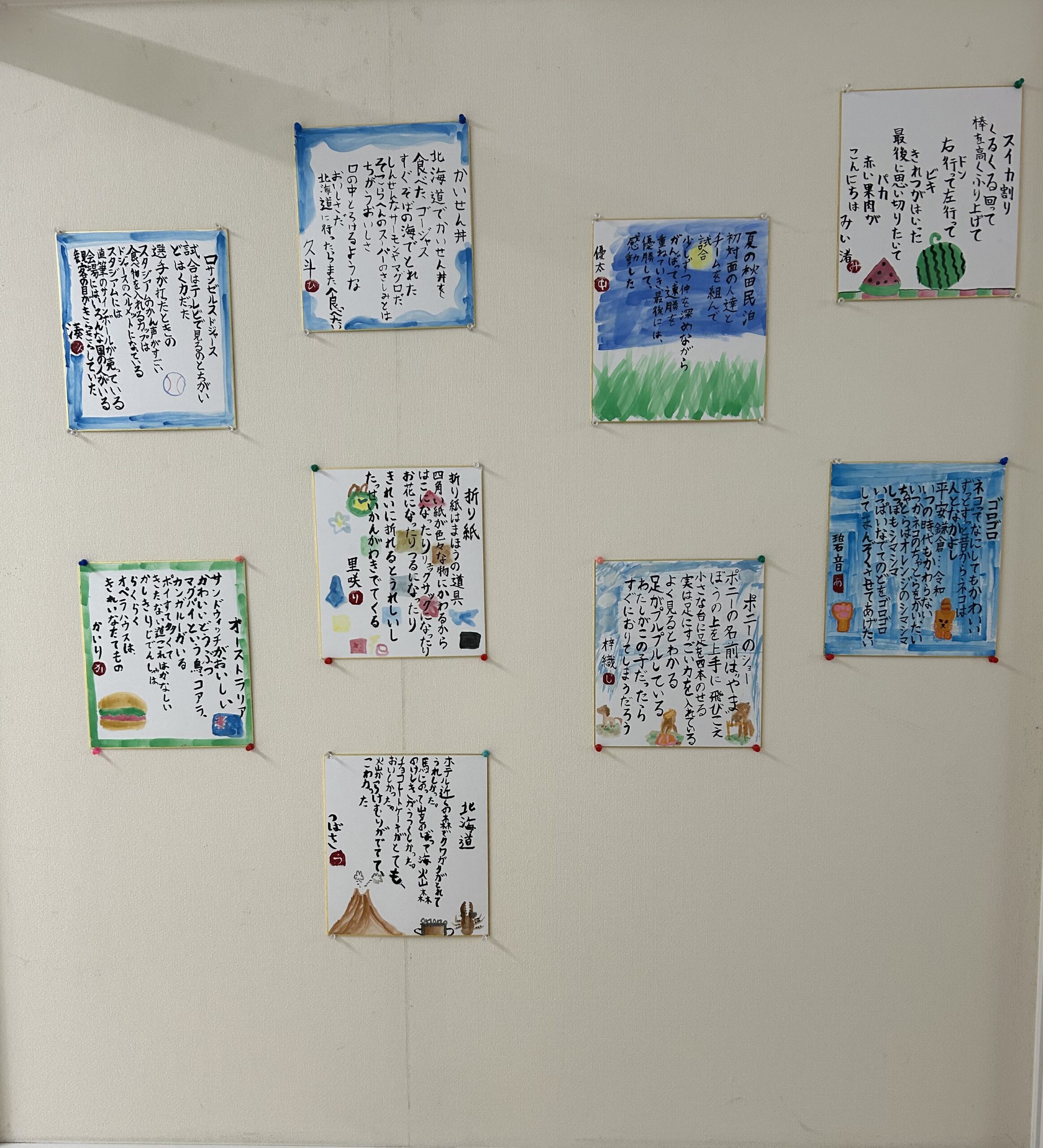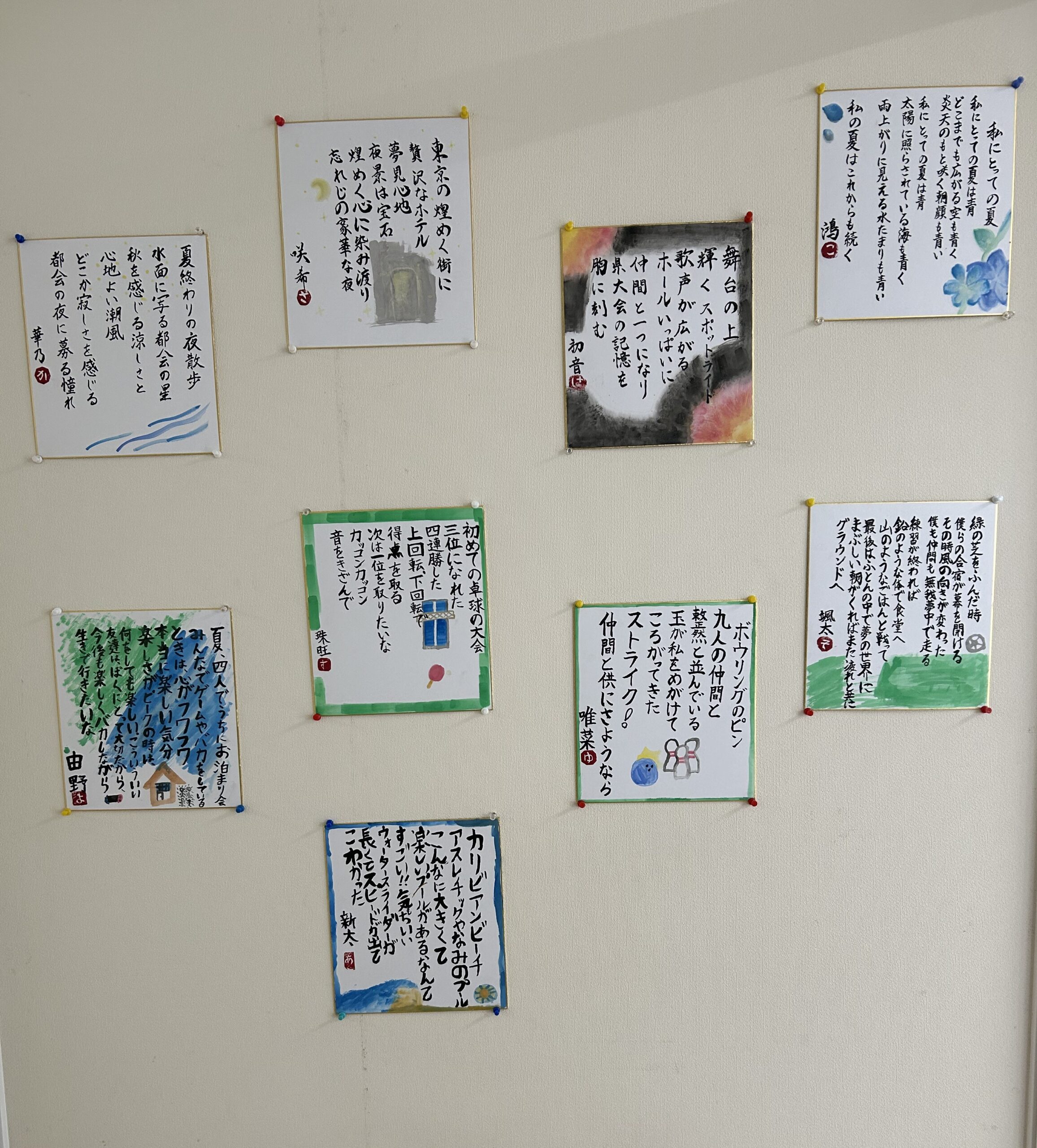 ○ 習字団体「春陽会」の小学生・中学生が色紙に「夏休みのおもいで」をテーマにした作品を展示しております。当館ご利用の際やお近くにお越しの際は、ぜひご覧くださいませ。