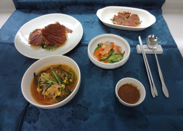 メニューは、ユッケジャンスープ、野菜とエビの松の実和え、チヂミ、ごはん、黒豆茶でした。
