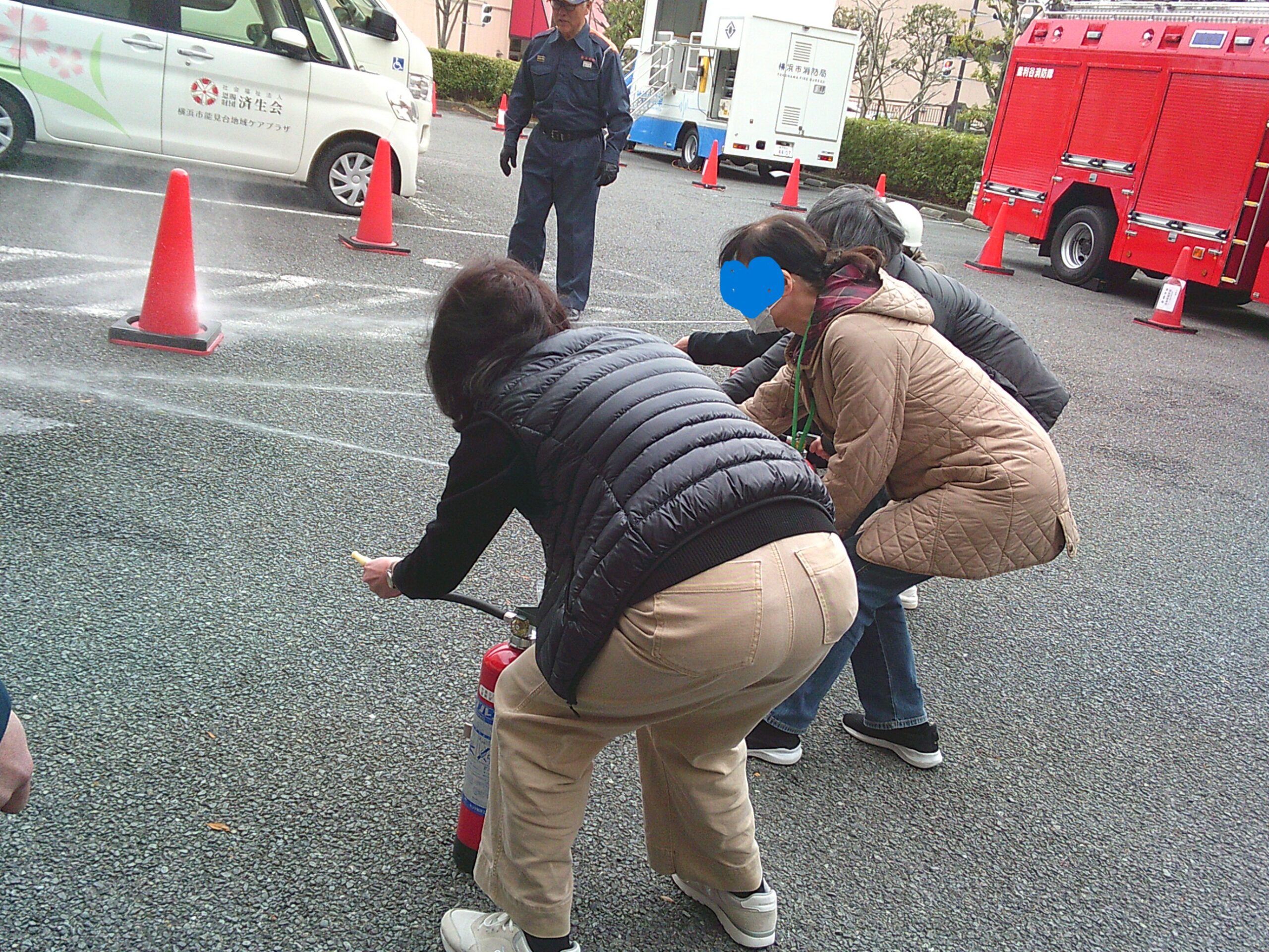 2月26日、釜利谷消防署の方々にご協力をいただき、地域ケアプラザと合同で、震度6強の地震により1階厨房から火災が発生した想定で防災訓練を行いました。