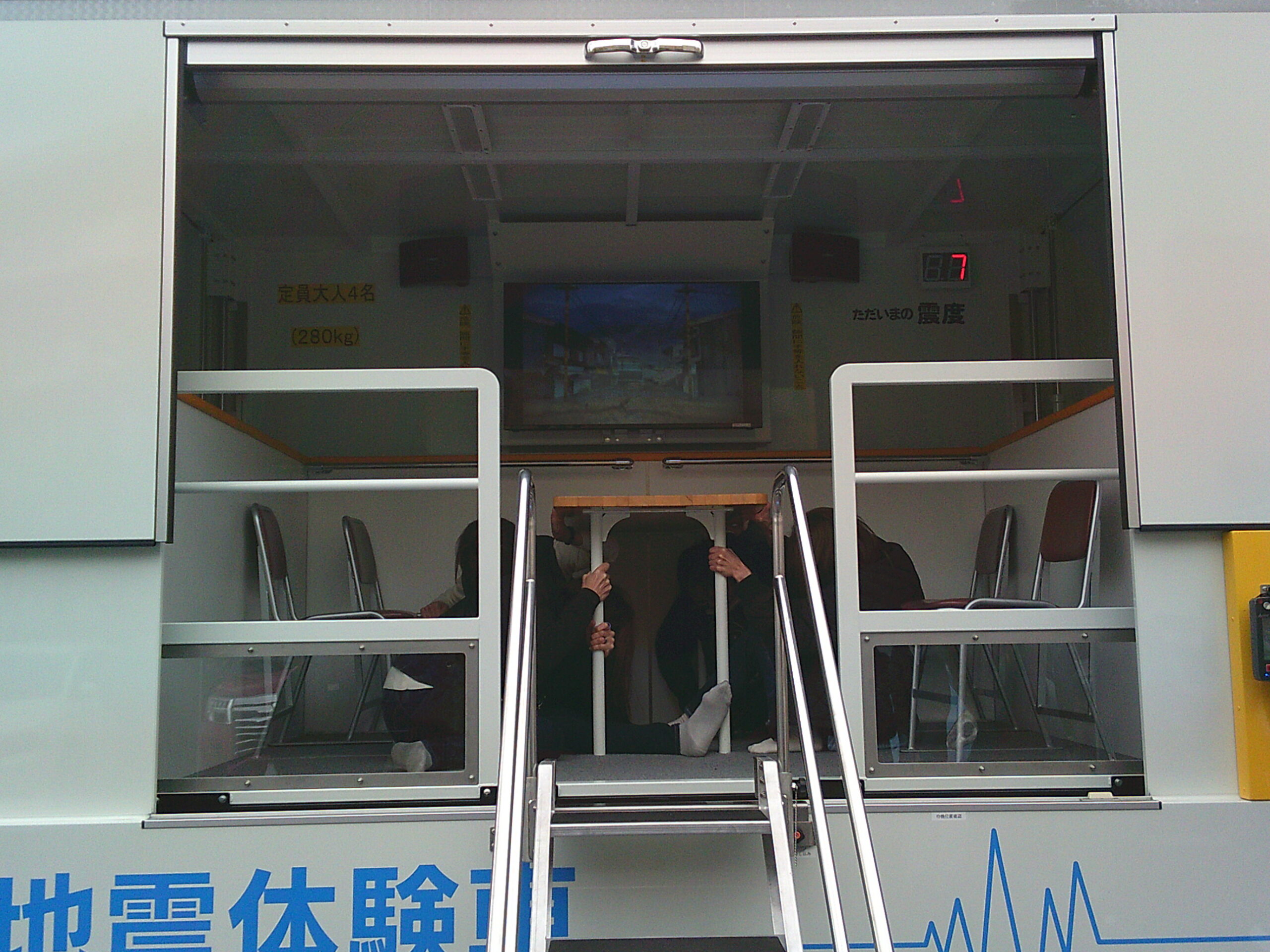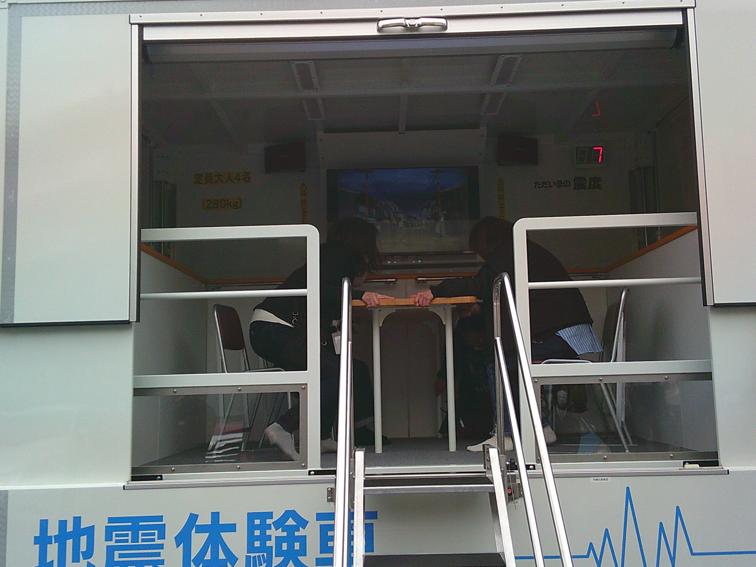 最新型の起震車での訓練もさせていただきましたが、想像以上に揺れは激しく、頭などを守るため、机の下にもぐることさえ容易には出来ませんでした。訓練といえども恐怖を感じる貴重な体験をさせていただきました。