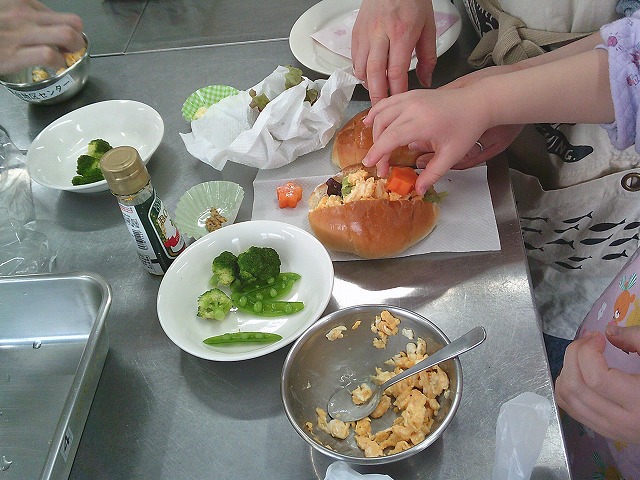 お子さんたちは、野菜を切ったり、パンに好きな具材をのせたり、保護者の方と一緒に楽しみながら取り組んでいました。