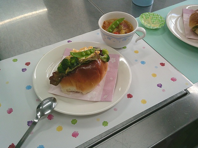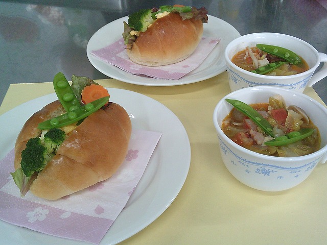 今回のメニューは、彩り豊かな野菜をはさんだサンドイッチと、具だくさんのあたたかいスープ。